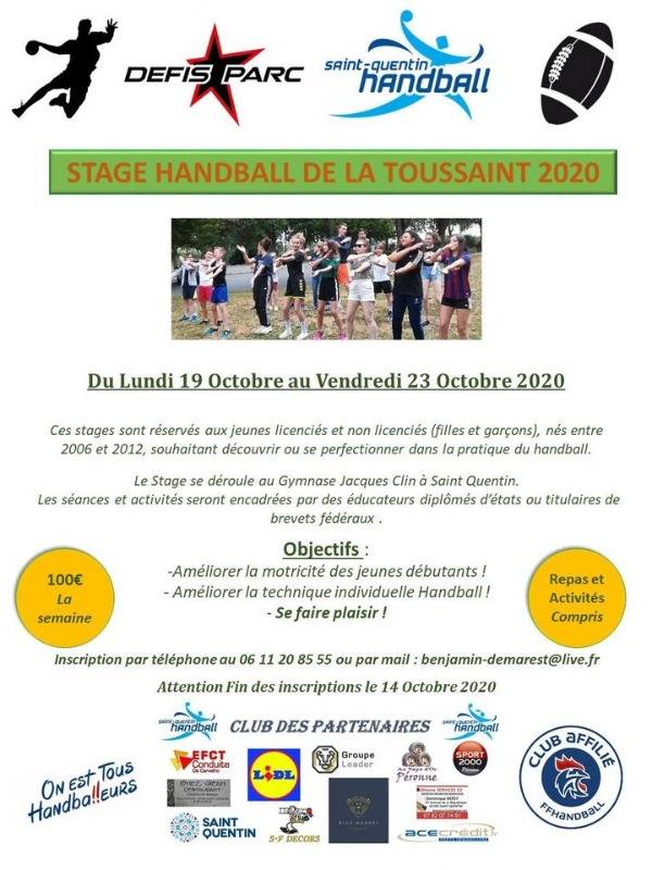 Stage de handball du 19 au 23 octobre 2020 au Gymnase Clin réservé aux jeunes licenciés ou non nés entre 2006 et 2012 souhaitant découvrir ou se perfectionner au handball